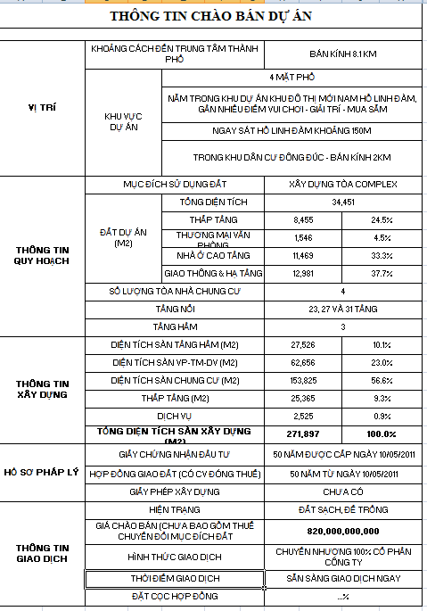 CHUYỂN NHƯỢNG DỰ ÁN PHỨC HỢP KHU ĐÔ THỊ NAM LINH ĐÀM